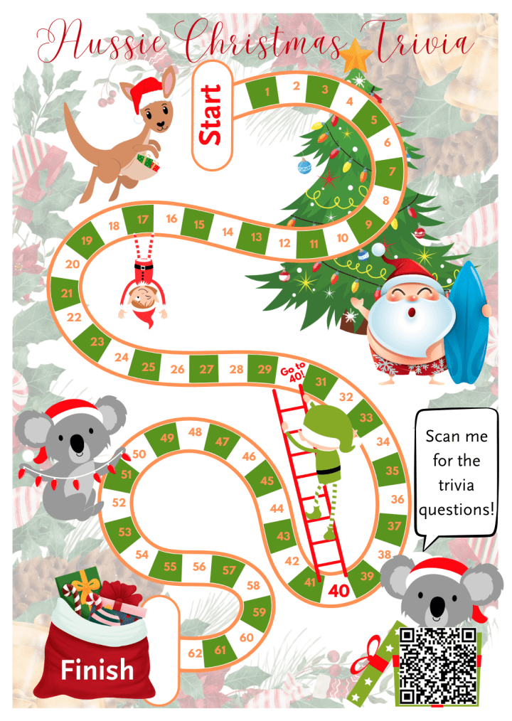 “Aussie Chrissy Trivia” is a FREE board game that is downloadable in PDF format. You can print it on A4 and laminate it. Use the QR code at the bottom right of the board game to access the trivia questions!